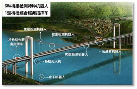 研制水、陸、空立體協(xié)同的大跨度橋梁檢測與評估裝備體系,形成全地域全橋型的檢測能力,實現(xiàn)橋梁表面、纜索、水下結(jié)構(gòu)等關(guān)鍵部位的高效初檢、全面詳檢、數(shù)據(jù)分析、損傷評估等一體化服務(wù),極大提高大跨度橋梁定檢、特