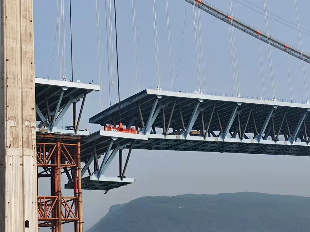 在大橋建造關鍵技術上,作為大跨徑公軌兩用橋梁,如何滿足軌道剛度指標要求是橋梁設計的重點,更是難點。招商交科設計項目組根據(jù)橋位處實際地形條件,經(jīng)過多方案比選及論證,創(chuàng)新性提出采用“單孔懸吊雙塔三跨連續(xù)”的結構體系,在不增加橋梁造價的前提下,巧妙解決了軌道剛度要求高等技術難題,使公軌兩用橋采用大跨度懸索橋成為可能,為類似工程的設計提供了寶貴經(jīng)驗。