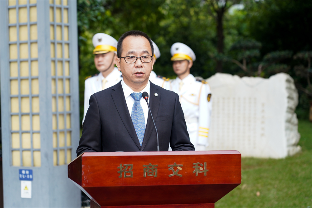 升旗儀式上,身著白色制服的儀仗隊員護著國旗、招商局旗,邁著整齊的步伐走向升旗臺。在《國歌》和《招商局之歌》的莊嚴歌聲中,五星紅旗和招商局旗先后冉冉升起,迎風飛揚。