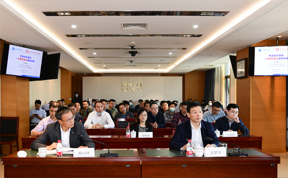 講座中,楊永斌院士以“橋梁動態(tài)感知——車輛掃描法最新進展”為題,從當前公路橋梁管理養(yǎng)護難、傳統(tǒng)檢測技術(shù)供給不足的背景出發(fā),提出車輛掃描法這一智慧管養(yǎng)系統(tǒng),并從車輛掃描法的理論簡介、力學模型和增效技術(shù)等三方面進行分析講解。車輛掃描法集成了眾多先進技術(shù),通過紀錄通過橋梁時的車體加速度時程響應(yīng),并從橋梁響應(yīng)頻譜找出橋梁頻率,用濾波器提取某一橋頻的分量響應(yīng),建立該橋頻的瞬時(當下)振幅歷時,得出對應(yīng)于該橋頻的模態(tài)。講座中,橋梁加固院、招商路檢、物康公司的科研一線員工結(jié)合自身崗位實踐,與楊永斌院士進行了深入的互動交流。