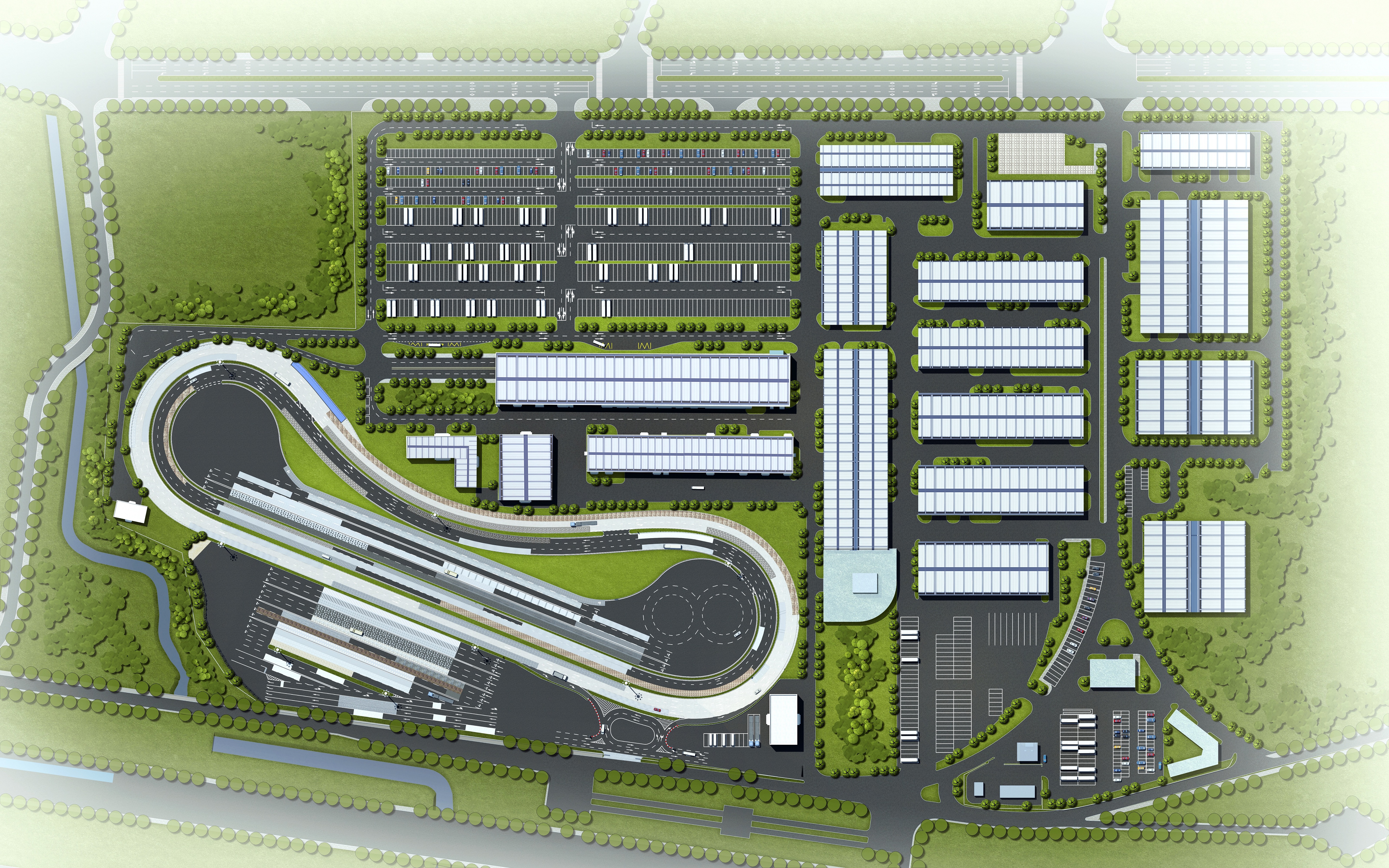 車檢院二期效果圖(鳥瞰圖) 新能源智能網(wǎng)聯(lián)汽車及智慧交通科技創(chuàng)新基地位于重慶市高新技術(shù)產(chǎn)業(yè)開發(fā)區(qū)金鳳電子信息產(chǎn)業(yè)園,總占地總面積16.76萬㎡,其中試驗(yàn)道路占地7.89萬㎡,包括氣囊誤作用試驗(yàn)道路、NVH評(píng)價(jià)試驗(yàn)道路、強(qiáng)化耐久試驗(yàn)道路等3個(gè)區(qū)域,涉及比利時(shí)路、維也納路、坑洼路、扭曲路、搓板路、波形路、顛簸路、凸塊路、魚鱗坑、卵石路等50多種特種道路。項(xiàng)目建成后,將用于汽車和摩托車新產(chǎn)品研究開發(fā)試驗(yàn)、標(biāo)準(zhǔn)驗(yàn)證及可靠性試驗(yàn)、相關(guān)法規(guī)試驗(yàn)等。