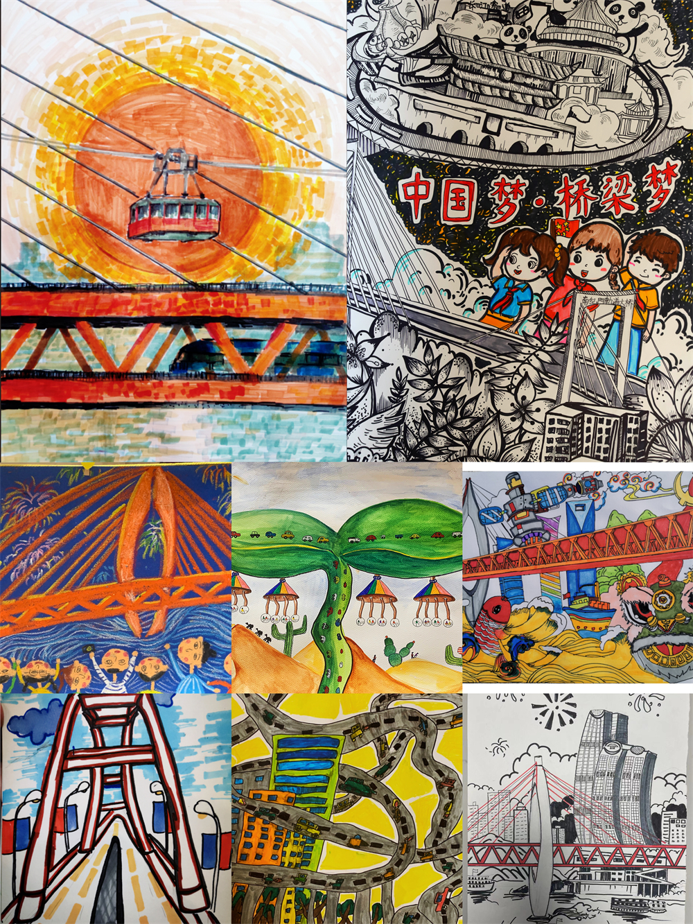 本次主題公益活動(dòng)深入貫徹黨的二十大精神,堅(jiān)持把科普作為提高全社會(huì)文明程度的重要舉措,牢固樹立“科技創(chuàng)新,科學(xué)普及是實(shí)現(xiàn)創(chuàng)新發(fā)展的兩翼,要把科學(xué)普及放在與科技創(chuàng)新同等重要的位置”的理念,力圖通過傳播橋梁科普知識(shí),落實(shí)“培育創(chuàng)新文化,弘揚(yáng)科學(xué)家精神,涵養(yǎng)優(yōu)良學(xué)風(fēng),營(yíng)造創(chuàng)新氛圍”的指示精神,活動(dòng)的成功舉辦有效激發(fā)了小朋友們的想象力,引導(dǎo)他們以手中的筆生動(dòng)地展示出心目中的重慶橋梁。畫展作品中,有用抽象的筆觸勾勒出深紅東水門大橋與橙黃太陽(yáng)的和諧畫面,以大膽的配色展示出千廝門大橋與新年煙花輝映的熱鬧場(chǎng)景,更有把輕軌穿樓、重慶火鍋、千廝門大橋畫在一起,突出了重慶獨(dú)特的文化風(fēng)貌。文字作品中,小朋友們關(guān)注到了橋梁養(yǎng)護(hù)工人的工作,以橋梁寄托了對(duì)親人的真摯思念情,記錄了非物質(zhì)文化遺產(chǎn)的傳承、經(jīng)濟(jì)社會(huì)的繁榮與發(fā)展,更是以生動(dòng)的語(yǔ)言挖掘出朝天門大橋面臨的前所未有的挑戰(zhàn)……他們寫道“城市睡著了,橋?yàn)槿藗円龑?dǎo)方向?!?/div>