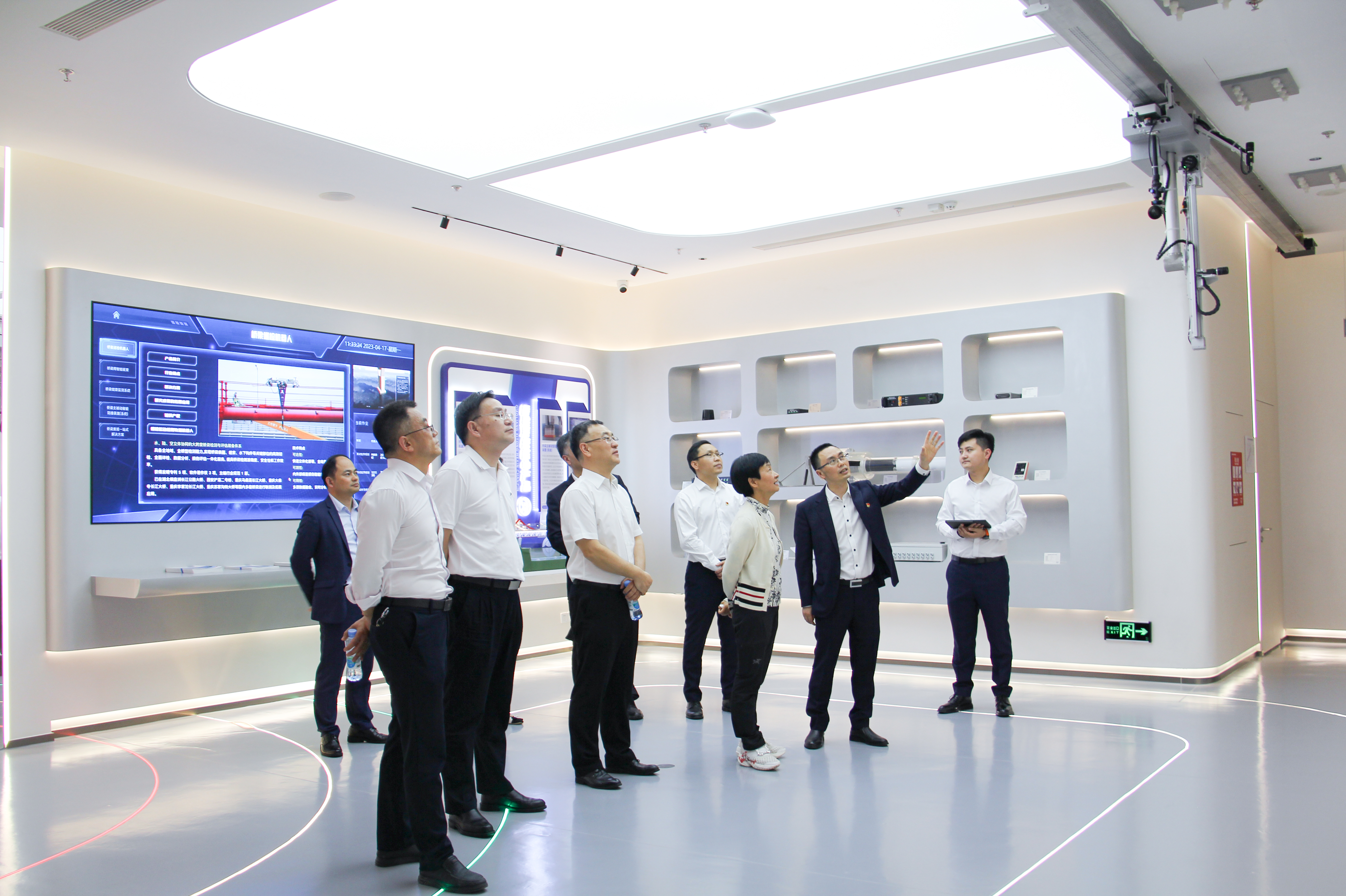 段湘暉詳細考察了重慶曾家?guī)r大橋工程項目(以下簡稱:曾家?guī)r項目)及曾家?guī)r公司科技展館,聽取曾家?guī)r項目建設過程、科研規(guī)劃、成果應用、運營維護等情況匯報,對展館中陳列展示的“交通智慧運維平臺”“橋梁巡檢機器人”“隧道巡檢機器人”“公路隧道運營與安全培訓VR互動體驗”等創(chuàng)新成果給予好評。