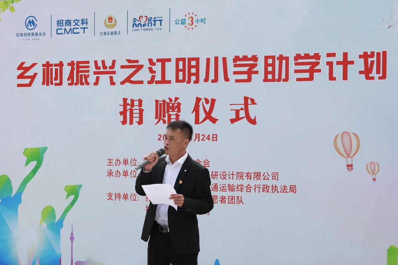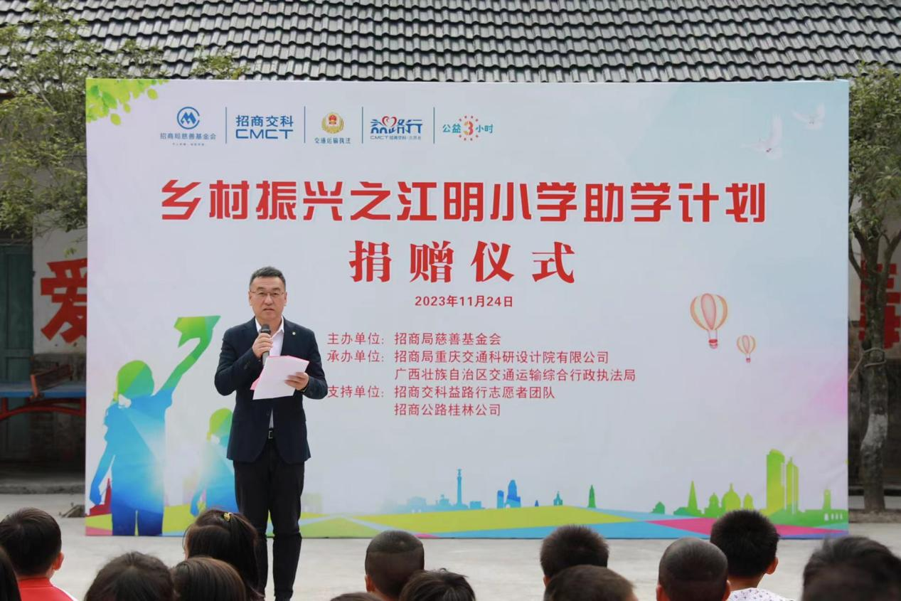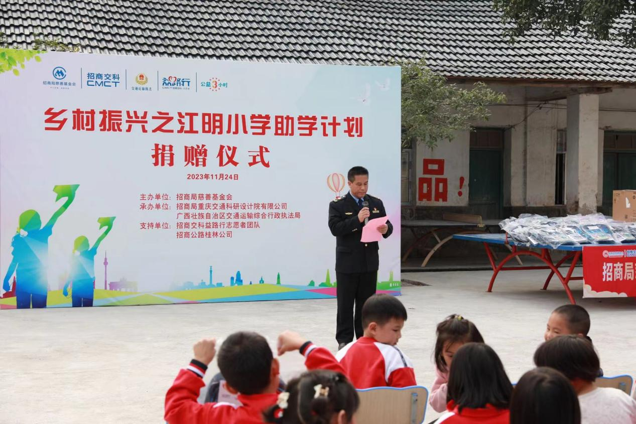 彭金濤在捐贈(zèng)儀式致辭中表示,經(jīng)廣西交通執(zhí)法局推介和招商交科廣西分公司實(shí)地考察,江明小學(xué)助學(xué)項(xiàng)目得到招商局慈善基金會(huì)和招商交科的高度重視和大力支持,在征得校方同意后,先后為學(xué)校捐贈(zèng)了一批急需教學(xué)物資和愛(ài)心書籍,希望以此為江明小學(xué)鄉(xiāng)村振興與校園助學(xué)貢獻(xiàn)綿薄之力,同時(shí)也期待這項(xiàng)“聯(lián)動(dòng)一家親活動(dòng)”能夠持續(xù)開展,讓學(xué)生在愛(ài)心V書屋中享受閱讀,在閱讀的過(guò)程中了解世界和培養(yǎng)良好的習(xí)慣。