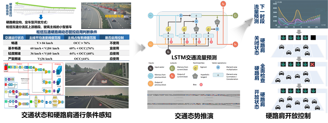 團(tuán)隊(duì)提出安全導(dǎo)向、效率提升的樞紐互通上游段硬路肩定向定車型開放策略及運(yùn)行管理方式;研發(fā)了仿真推演驅(qū)動(dòng)的硬路肩動(dòng)態(tài)管控算法,以及基于機(jī)器視覺的硬路肩路面狀況實(shí)時(shí)監(jiān)測算法;基于“交通狀態(tài)感知-交通流量預(yù)測-交通態(tài)勢推演-硬路肩開放”,實(shí)現(xiàn)了交通流量激增下,高速公路樞紐互通上游段硬路肩動(dòng)態(tài)管控。硬路肩動(dòng)態(tài)開放應(yīng)用在樞紐互通上游段可提升20%以上的通行能力,相當(dāng)于新增了一個(gè)行車道。