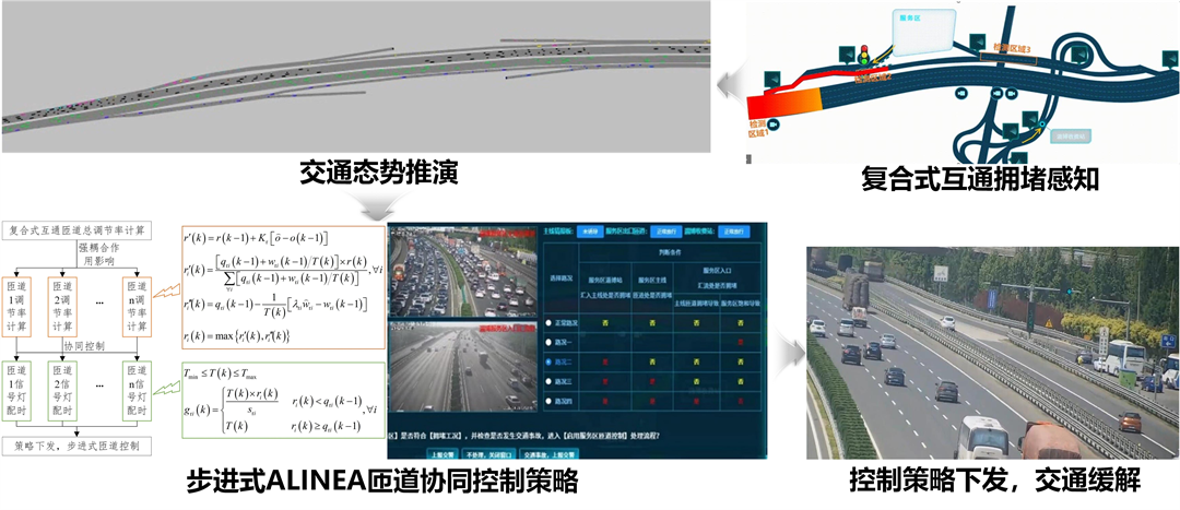 團(tuán)隊(duì)針對相鄰短間距互通形成的復(fù)合式互通,在“感知-預(yù)測-研判-管控”的框架下,考慮交通狀態(tài)的耦合特性,提出了雙匝道自適應(yīng)協(xié)同控制方法;研發(fā)了復(fù)合式互通合流區(qū)雙匝道步進(jìn)式ALINEA控制算法、主線提前換道與入口匝道協(xié)同控制算法,解決了復(fù)合式互通復(fù)雜交織段通行能力降低的問題。步進(jìn)式協(xié)同匝道控制應(yīng)用在復(fù)合式互通合流區(qū)可減少16%的車輛延誤,有效降低了交織沖突引發(fā)的交通事故。