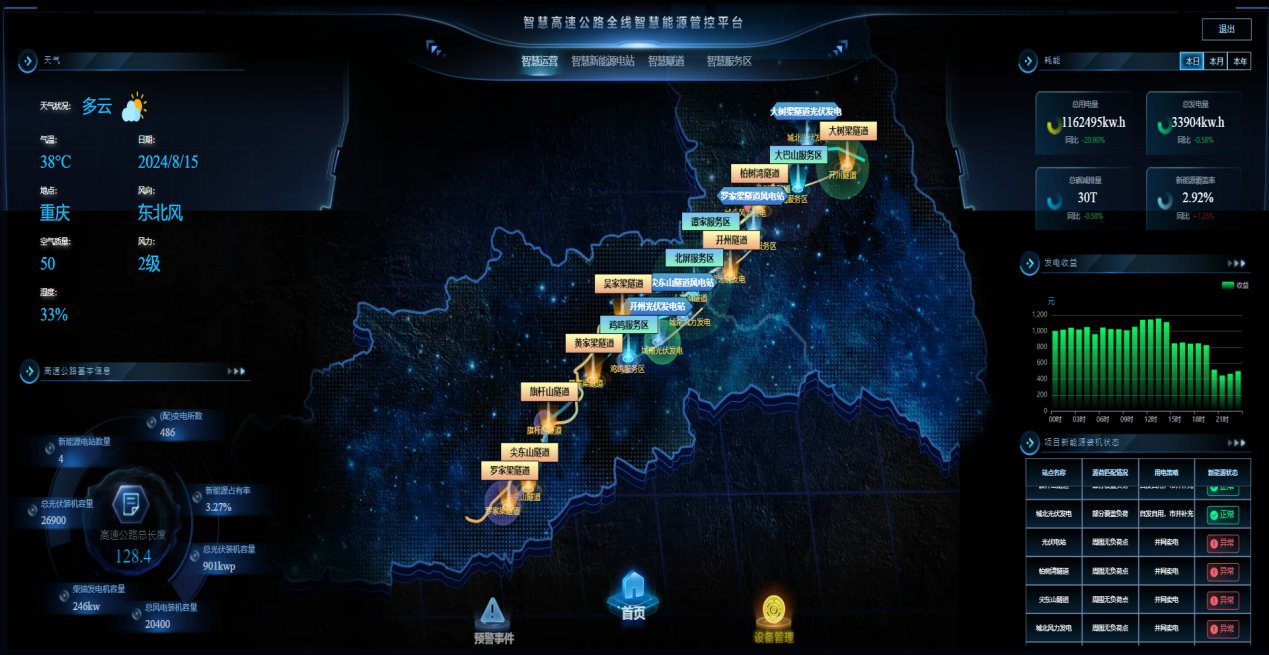 智慧能源管控平臺集高速公路全線供電側(cè)與負(fù)載側(cè)于一體,結(jié)合發(fā)電預(yù)測、用能預(yù)測、可靠性冗余、用能匹配及節(jié)能決策等智能算法,實(shí)時分析高速公路沿線綠色能源出力與用能,形成綠色能源不確定性出力與沿線負(fù)載動態(tài)用能的匹配決策,實(shí)現(xiàn)高速公路全線能源的智能化管理與優(yōu)化目標(biāo),助力高速公路全線精準(zhǔn)降碳、降本增效。