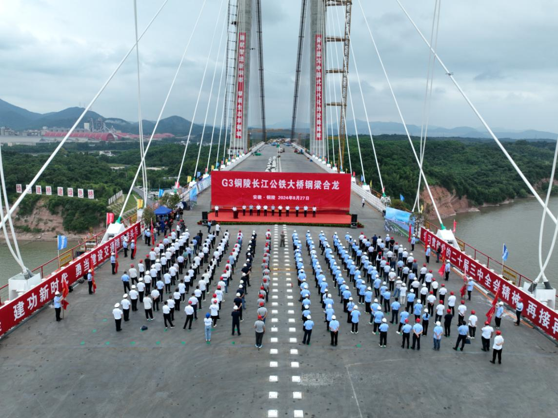 2024年8月27日,隨著大橋兩側(cè)節(jié)段鋼梁準(zhǔn)確就位,位于安徽省銅陵市的G3銅陵長江公鐵大橋正式合龍,招商交科下屬萬橋公司董事長、黨委書記李闖受邀參加合龍儀式。
