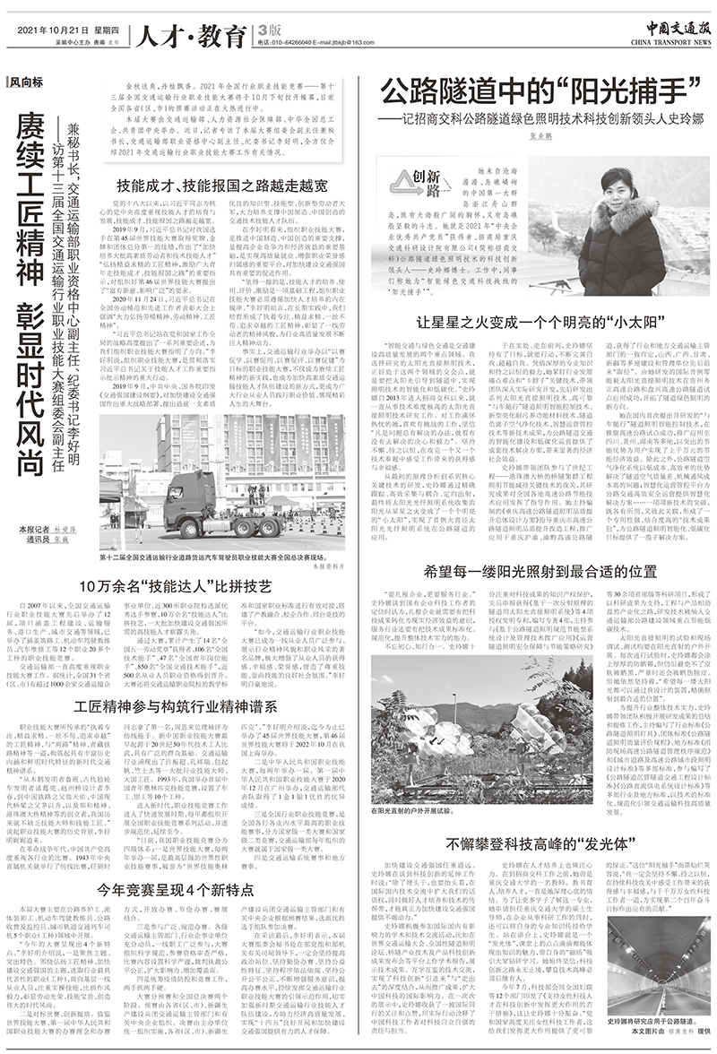 【編者按】史玲娜,現(xiàn)任招商交科交通與節(jié)能工程院副院長,自2013年進入公司以來,就長期致力于太陽光光纖照明技術(shù)方面的研究工作,她以卓越的成績詮釋了一線科技工作者的責(zé)任與擔(dān)當(dāng),獲評為2021年“中央企業(yè)優(yōu)秀共產(chǎn)黨員”。2021年10月21日,《中國交通報》以《公路隧道中的“陽光捕手”——記招商交科公路隧道綠色照明技術(shù)的科技創(chuàng)新領(lǐng)頭人史玲娜》為題,刊發(fā)專題報道,講述了史玲娜長期扎根于公路交通科技創(chuàng)新一線的奮斗故事。現(xiàn)將報道原文轉(zhuǎn)載如下: