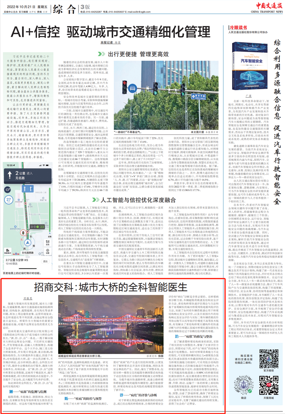 2022年10月21日,《中國(guó)交通報(bào)》在第三版以《招商交科:城市大橋的全科職能醫(yī)生》為題,全文刊發(fā)橋梁研究院文章,展現(xiàn)招商交科通過(guò)開(kāi)發(fā)智能設(shè)備,融入大數(shù)據(jù)理念,構(gòu)建全息養(yǎng)護(hù)平臺(tái)等多種方式,解決城市大橋的運(yùn)維安全問(wèn)題,為建設(shè)交通強(qiáng)國(guó)、數(shù)字中國(guó)貢獻(xiàn)交科方案。