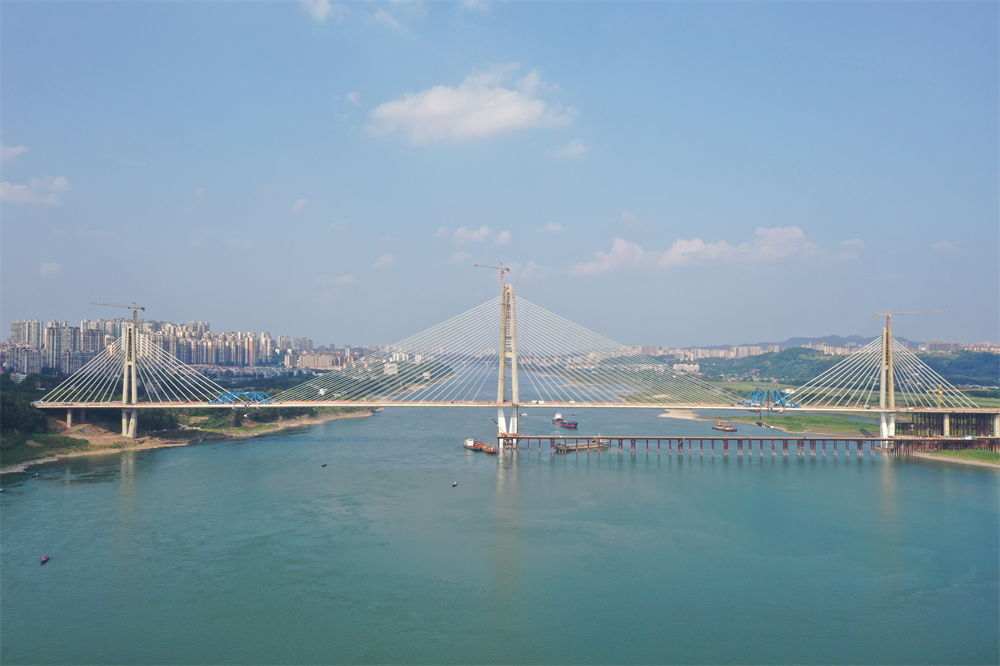 瀘州長江六橋于2016年1月開工建設(shè),是目前世界上在建最大公軌兩用三塔斜拉橋,橋梁全長1722米,主橋采用三塔斜拉橋設(shè)計(jì),長1080米,近期為雙向八車道,遠(yuǎn)期為雙向六車道+軌道通道公軌兩用大橋。大橋計(jì)劃于今年年底正式通車,通車后將改善當(dāng)?shù)氐某鲂袟l件,助力成渝雙城經(jīng)濟(jì)圈建設(shè)。