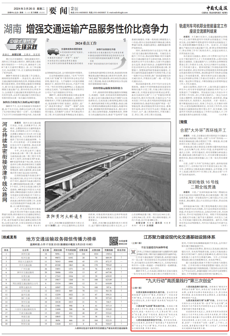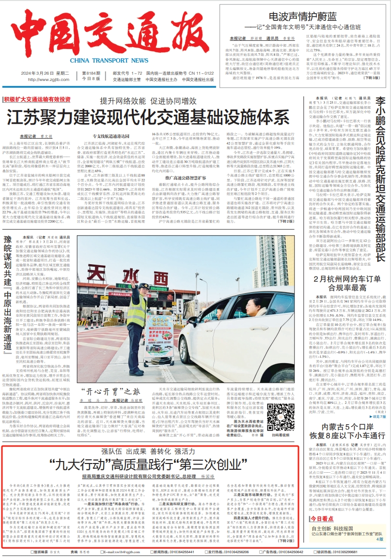 3月26日,《中國交通報(bào)》在第一、第二版全文刊發(fā)了招商交科黨委副書記、總經(jīng)理?xiàng)顕迨鹈恼隆稄?qiáng)隊(duì)伍 出成果 善轉(zhuǎn)化 強(qiáng)活力|“九大行動”高質(zhì)量踐行“第三次創(chuàng)業(yè)”》。