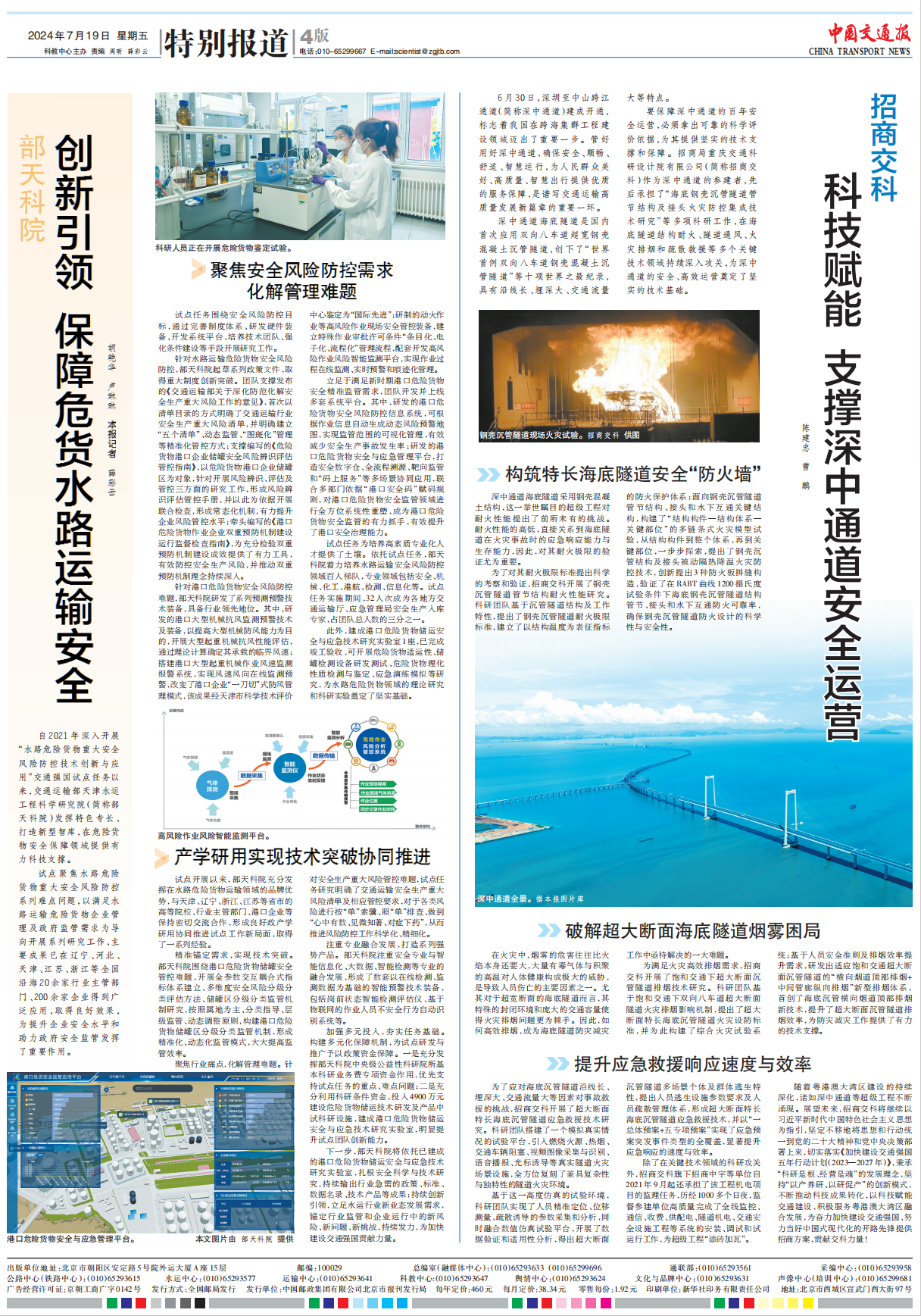 7月19日,《中國交通報》在第四版“特別報道”刊發(fā)了《招商交科:科技賦能 支撐深中通道安全運(yùn)營》文章,介紹了招商交科作為深中通道的參建單位之一,在海底隧道結(jié)構(gòu)耐火、隧道通風(fēng)、火災(zāi)排煙和疏散救援等技術(shù)攻關(guān)方面作出的貢獻(xiàn)?,F(xiàn)將全文轉(zhuǎn)載如下: